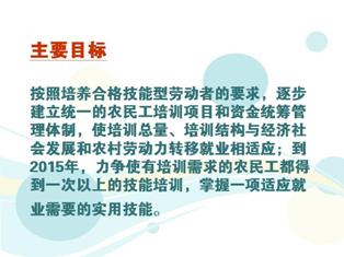 (二)主要目標(biāo)。按照培養(yǎng)合格技能型勞動(dòng)者的要求,逐步建立統(tǒng)一的農(nóng)民工培訓(xùn)項(xiàng)目和資金統(tǒng)籌管理體制,使培訓(xùn)總量、培訓(xùn)結(jié)構(gòu)與經(jīng)濟(jì)社會(huì)發(fā)展和農(nóng)村勞動(dòng)力轉(zhuǎn)移就業(yè)相適應(yīng);到2015年,力爭(zhēng)使有培訓(xùn)需求的農(nóng)民工都得到一次以上的技能培訓(xùn),掌握一項(xiàng)適應(yīng)就業(yè)需要的實(shí)用技能。