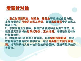 (五)以市場(chǎng)需求為導(dǎo)向,增強(qiáng)培訓(xùn)針對(duì)性。建立培訓(xùn)與就業(yè)緊密銜接的機(jī)制,適應(yīng)經(jīng)濟(jì)結(jié)構(gòu)調(diào)整和企業(yè)崗位需求,及時(shí)調(diào)整培訓(xùn)課程和內(nèi)容。重點(diǎn)加強(qiáng)建筑業(yè)、制造業(yè)、服務(wù)業(yè)等吸納就業(yè)能力強(qiáng)、市場(chǎng)容量大的行業(yè)的農(nóng)民工培訓(xùn)。做好水庫(kù)移民中的農(nóng)民工培訓(xùn)工作。以實(shí)現(xiàn)就業(yè)為目標(biāo),根據(jù)產(chǎn)業(yè)發(fā)展和企業(yè)用工情況,組織開(kāi)展靈活多樣的訂單式培訓(xùn)、定向培訓(xùn),增強(qiáng)培訓(xùn)的針對(duì)性和有效性。根據(jù)縣域經(jīng)濟(jì)發(fā)展人才需求,開(kāi)展實(shí)用技能培訓(xùn),促進(jìn)農(nóng)村勞動(dòng)力就地就近轉(zhuǎn)移就業(yè);結(jié)合勞務(wù)輸出開(kāi)展專項(xiàng)培訓(xùn),培育和扶持具有本地特色的勞務(wù)品牌,促進(jìn)有組織的勞務(wù)輸出。
