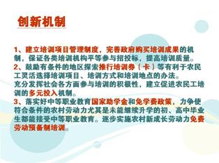 (六)創(chuàng)新農(nóng)民工培訓(xùn)機(jī)制。國(guó)務(wù)院農(nóng)民工工作聯(lián)席會(huì)議要組織協(xié)調(diào)有關(guān)部門(mén)建立培訓(xùn)項(xiàng)目管理制度,完善政府購(gòu)買培訓(xùn)成果的機(jī)制,保證承擔(dān)培訓(xùn)任務(wù)的院校、具備條件的企業(yè)培訓(xùn)機(jī)構(gòu)及其他各類培訓(xùn)機(jī)構(gòu)平等參與招投標(biāo),提高培訓(xùn)質(zhì)量。鼓勵(lì)有條件的地區(qū)探索推行培訓(xùn)券(卡)等有利于農(nóng)民工靈活選擇培訓(xùn)項(xiàng)目、培訓(xùn)方式和培訓(xùn)地點(diǎn)的辦法。充分發(fā)揮社會(huì)各方面參與培訓(xùn)的積極性,建立促進(jìn)農(nóng)民工培訓(xùn)的多元投入機(jī)制。落實(shí)好中等職業(yè)教育國(guó)家助學(xué)金和免學(xué)費(fèi)政策,力爭(zhēng)使符合條件的農(nóng)村勞動(dòng)力尤其是未能繼續(xù)升學(xué)的初、高中畢業(yè)生都能接受中等職業(yè)教育。逐步實(shí)施農(nóng)村新成長(zhǎng)勞動(dòng)力免費(fèi)勞動(dòng)預(yù)備制培訓(xùn)。