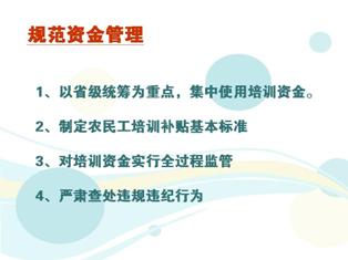 (七)以省級(jí)統(tǒng)籌為重點(diǎn),集中使用培訓(xùn)資金。各省(區(qū)、市)要將農(nóng)民工培訓(xùn)資金列入財(cái)政預(yù)算,進(jìn)一步加大農(nóng)民工培訓(xùn)資金投入,并按照統(tǒng)籌規(guī)劃、集中使用、提高效益的要求,將中央和省級(jí)財(cái)政安排的各項(xiàng)農(nóng)民工培訓(xùn)資金統(tǒng)籌使用,各部門(mén)根據(jù)職責(zé)和任務(wù),做好相關(guān)培訓(xùn)工作,改變資金分散安排、分散下達(dá)、效益不高的狀況。國(guó)家有關(guān)部門(mén)要依據(jù)新一輪全國(guó)農(nóng)民工培訓(xùn)規(guī)劃和年度計(jì)劃,統(tǒng)籌安排農(nóng)民工培訓(xùn)資金,對(duì)地方予以適當(dāng)補(bǔ)助。