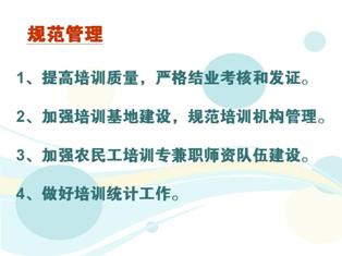 4.突出重點(diǎn)、講求實(shí)效。重點(diǎn)發(fā)揮企業(yè)和院校產(chǎn)學(xué)結(jié)合的作用,加強(qiáng)農(nóng)民工職業(yè)技能培訓(xùn)、在崗技能提升培訓(xùn)、創(chuàng)業(yè)培訓(xùn)和農(nóng)村實(shí)用技術(shù)培訓(xùn)。著力提升培訓(xùn)質(zhì)量,使經(jīng)過(guò)培訓(xùn)的農(nóng)民工都能掌握一項(xiàng)實(shí)用技能,提高培訓(xùn)后的就業(yè)率。
