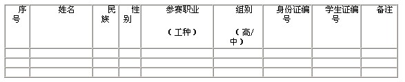 2、參賽學校按下表填報并于9月3日前將參賽人員名單(近期免冠一寸照片4張、身份證復印件、學生證復印件)報自治區(qū)職業(yè)技能競賽委員會辦公室: