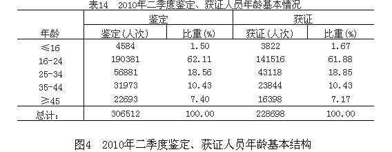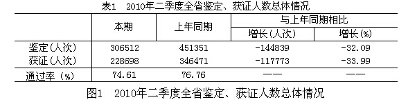 表1 2010年二季度全省鑒定、獲證人數(shù)總體情況