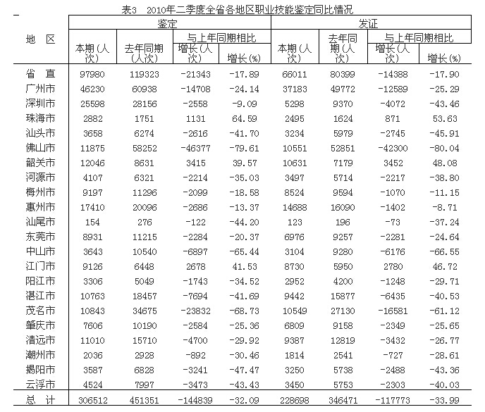 (一)全省鑒定人數(shù)和獲證人數(shù)同比有所下降。二季度全省鑒定人數(shù)和獲證人數(shù)同比分別減少了144839人次和117773人次,減幅分別為32.09%和33.99%。鑒定、獲證人數(shù)同比有所下降的主要原因:一是與去年同期相比,農(nóng)村勞動(dòng)力參加職業(yè)技能鑒定的人數(shù)有所減少;二是部分地市由于空白職業(yè)資格證書數(shù)量不足,推遲了部分考核批次鑒定的時(shí)間和證書打證的時(shí)間。三是從二季度開始深圳市人才引進(jìn)政策有所變化,將辦公軟件應(yīng)用、數(shù)據(jù)庫(kù)應(yīng)用(v-foxpro6.0)、Internet應(yīng)用(IE6.0)等部分計(jì)算機(jī)高新技術(shù)考試模塊從招調(diào)工職業(yè)工種目錄中刪除,深圳市高新技術(shù)考核人數(shù)同比大幅減少。