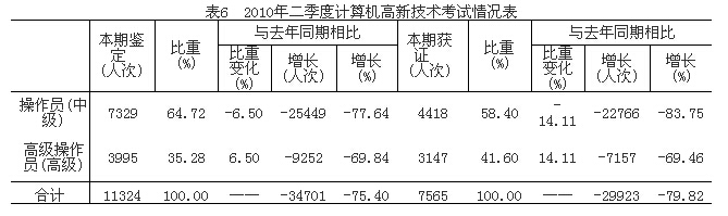 二季度全省參加職業(yè)技能鑒定和獲得職業(yè)資格證書人數(shù)分別為306512人次和228698人次,整體通過(guò)率74.61%;其中參加全國(guó)計(jì)算機(jī)高新技術(shù)考試11324人次,合格7565人次,合格率66.81%。全省組織專項(xiàng)職業(yè)能力考核8052人次,合格7755人次,合格率96.31%。