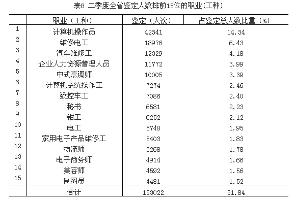 1.二季度全省鑒定人數(shù)排前15位的職業(yè)(工種)。