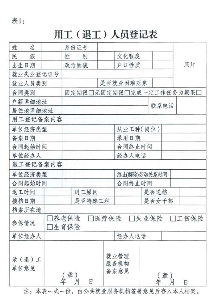 ①用工(退工)人員登記表(附表1);