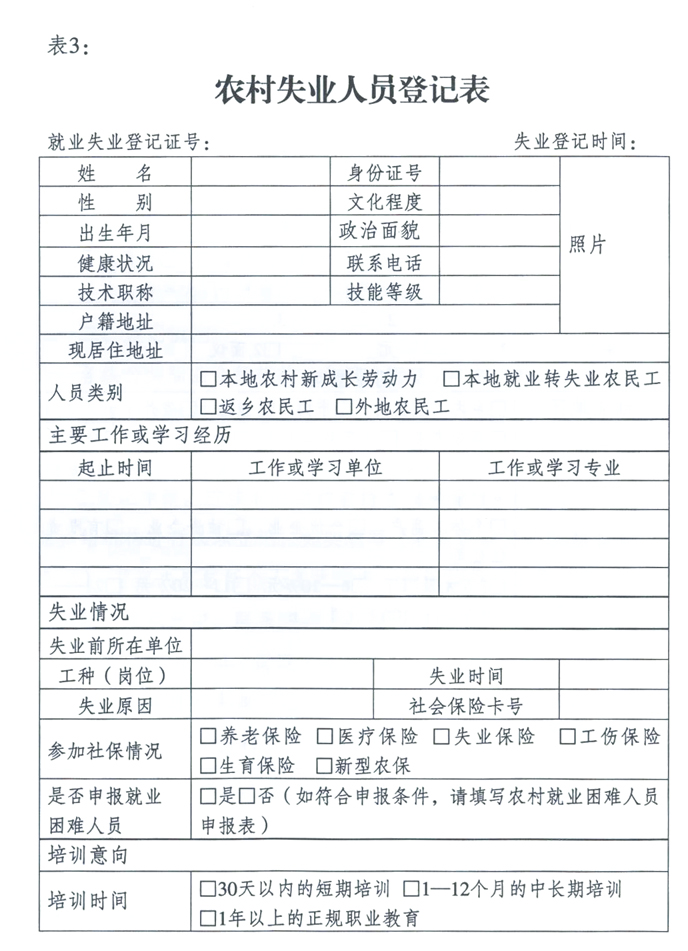 失業(yè)農(nóng)民到鄉(xiāng)鎮(zhèn)(街道)或者村(社區(qū))勞動就業(yè)社會保障公共服務(wù)平臺進行失業(yè)登記,填寫《農(nóng)村失業(yè)人員登記表》(見附表3),視為同時進行了求職登記。