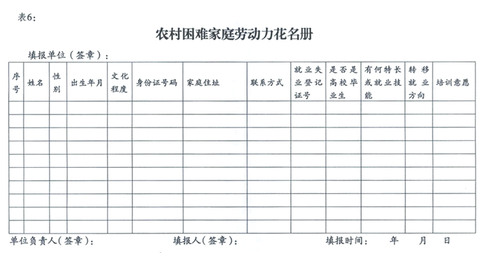 鄉(xiāng)鎮(zhèn)(街道)勞動就業(yè)社會保障服務(wù)所對申報材料進行復(fù)核,符合條件的,同時在鄉(xiāng)鎮(zhèn)(街道)和行政村公示一周;公示無異議的,7個工作目內(nèi)將《農(nóng)村困難家庭勞動力花名冊》(見表6)及申報表等相關(guān)材料報送縣級勞動就業(yè)管理機構(gòu)審核。