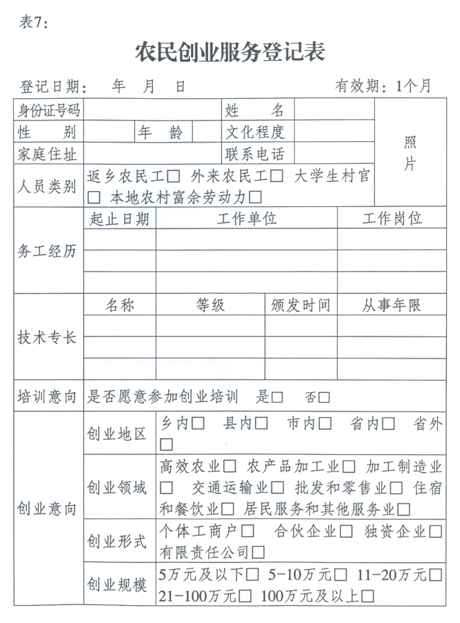 (1)有創(chuàng)業(yè)愿望和創(chuàng)業(yè)條件的農(nóng)村勞動者到戶籍所在地或常住地縣(市、區(qū))、鄉(xiāng)鎮(zhèn)(街道)農(nóng)民創(chuàng)業(yè)指導(dǎo)服務(wù)中心或者村級農(nóng)民創(chuàng)業(yè)指導(dǎo)站,如實填寫《農(nóng)民創(chuàng)業(yè)服務(wù)登記表》(見附表7)。登記內(nèi)容包括:個人基本情況和就業(yè)經(jīng)歷、創(chuàng)業(yè)培訓(xùn)意愿、創(chuàng)業(yè)意向等方面。