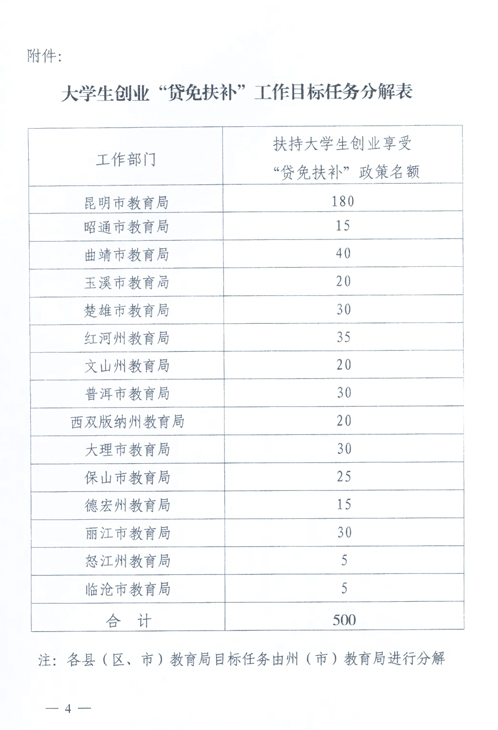 根據(jù)《云南省就業(yè)和再就業(yè)工作領(lǐng)導(dǎo)小組關(guān)于下達(dá)20l0年年度鼓勵(lì)創(chuàng)業(yè)“貸免扶補(bǔ)”工作目標(biāo)任務(wù)的通知》(云就業(yè)[2010]1號),今年起增加教育系統(tǒng)為全省鼓勵(lì)創(chuàng)業(yè)“貸免扶補(bǔ)”目標(biāo)任務(wù)的承辦單位,為順利推進(jìn)全省教育系統(tǒng)承辦500名在校大學(xué)生和大學(xué)畢業(yè)生的“貸免扶補(bǔ)”工作目標(biāo)任務(wù),現(xiàn)就有關(guān)問題通知如下: