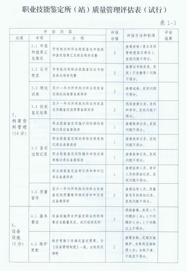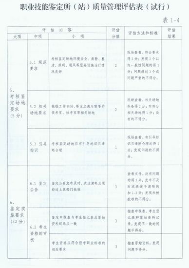 若所屬職業(yè)技能鑒定所(站)無上述情況之一的,再行對照《職業(yè)技能鑒定所(站)質(zhì)量管理評估表(試行)》開展合格評估工作。