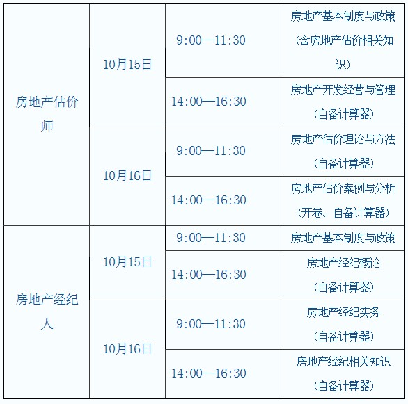 2011年度房地產(chǎn)估價師、房地產(chǎn)經(jīng)紀人執(zhí)業(yè)資格考試定于10月15日、16日進行,各科目考試時間如下: