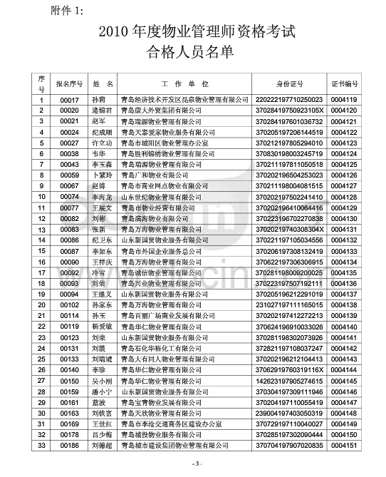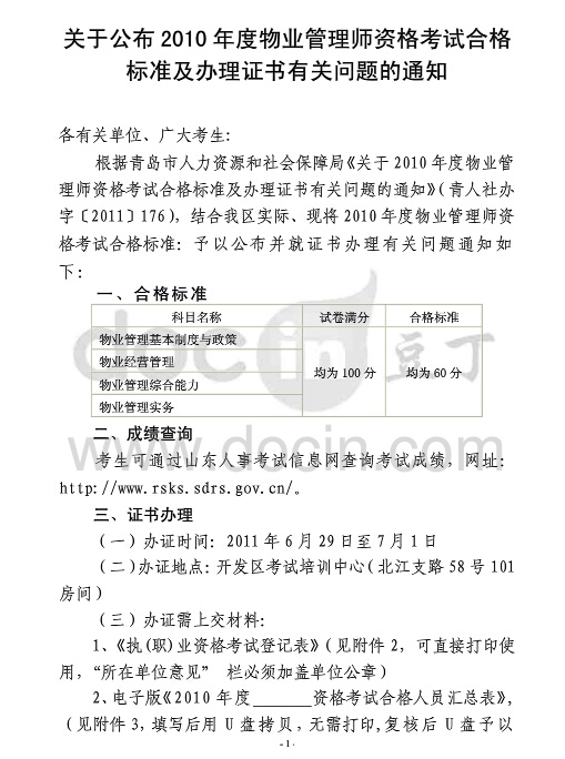 山東青島關(guān)于公布2010年度物業(yè)管理師資格考試合格標(biāo)準(zhǔn)及辦理證書有關(guān)問題的通知