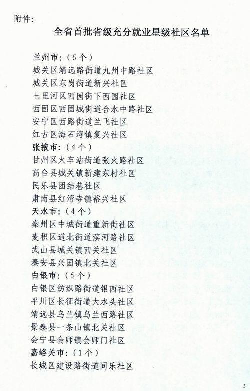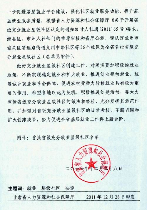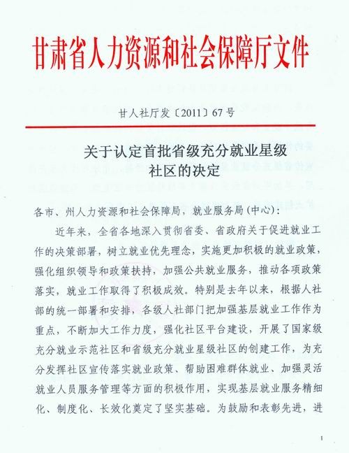 甘肅省人力資源和社會保障廳關(guān)于認定首批省級充分就業(yè)星級社區(qū)的決定(甘人社廳發(fā)[2011]67號)