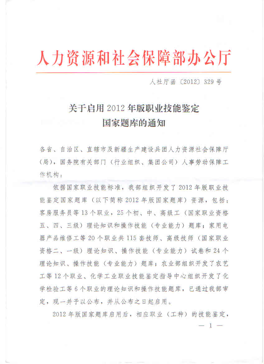 附件:《關(guān)于啟用2012年版職業(yè)技能鑒定國(guó)家題庫(kù)的通知》(人社廳函[2012]329)