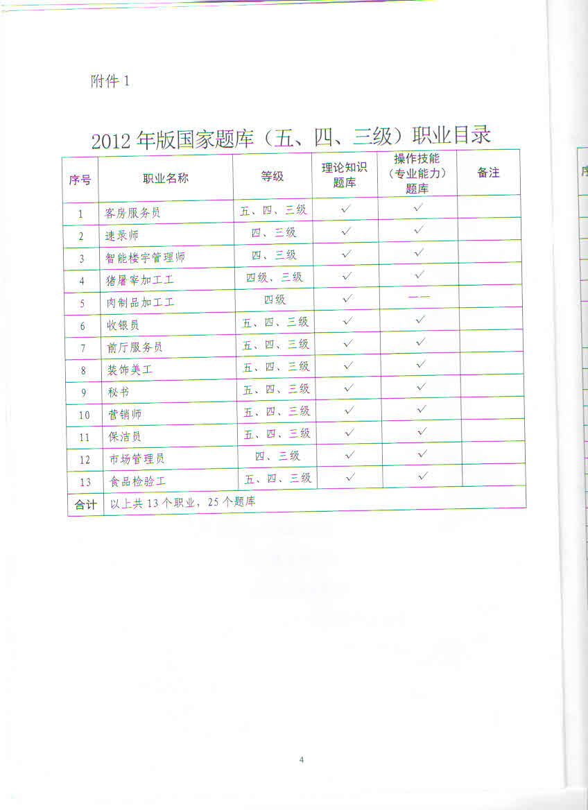 二、題庫資源的管理。二級以上職業(yè)(工種)和秘書(含涉外秘書)、營銷師、公關(guān)員、物業(yè)管理員、網(wǎng)絡(luò)編輯員、廣告設(shè)計師、企業(yè)文化師、智能樓宇管理師、創(chuàng)業(yè)咨詢師、可編程序控制系統(tǒng)設(shè)計師、客戶服務(wù)管理師、會展策劃師、商務(wù)策劃師、景觀設(shè)計師、動畫繪制員、家具設(shè)計師、包裝設(shè)計師、有害生物防治員、黃金投資分析師、網(wǎng)絡(luò)課件設(shè)計師、企業(yè)信息管理師、二手機動車估價師等現(xiàn)行的全國、全省統(tǒng)考職業(yè),計算機程序設(shè)計員、多媒體作品制作員、速錄師、婚姻家庭咨詢師、市場管理員以及采購師等職業(yè)題(卷)資源庫由省職業(yè)技能鑒定指導(dǎo)中心直接管理,不予配發(fā)。各有關(guān)市職業(yè)技能鑒定指導(dǎo)中心要嚴(yán)格按照分工使用題庫資源。2012年版職業(yè)技能鑒定國家題庫試題資源從2013年1月1日起使用。