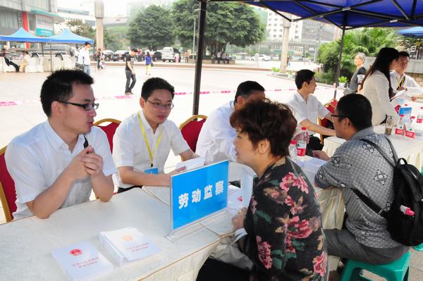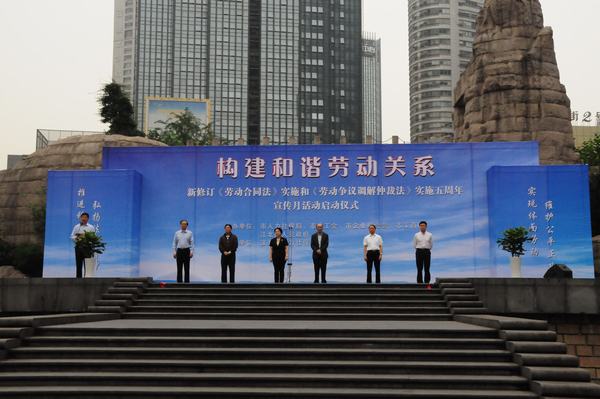 今年7月1日,是新修訂《勞動合同法》實(shí)施之日,也是《勞動爭議調(diào)解仲裁法》頒布實(shí)施五周年紀(jì)念日。為深入宣傳實(shí)施“兩法”,依法保護(hù)勞動者合法權(quán)益,促進(jìn)勞動關(guān)系和諧發(fā)展,5月31日上午,市人力社保局、市總工會、市企業(yè)聯(lián)合會、市工商聯(lián)、江北區(qū)人民政府在江北區(qū)觀音橋步行街廣場舉行了新修訂《勞動合同法》實(shí)施和《勞動爭議調(diào)解仲裁法》實(shí)施五周年宣傳月活動啟動儀式。儀式由市人力社保局副局長王安石主持,江北區(qū)人民政府區(qū)長何貴、市企業(yè)聯(lián)合會常務(wù)副會長吳冰、市總工會巡視員冉崇倫分別在儀式上作了講話,市人力社保局黨組書記、局長陳元春宣布全市“兩法”宣傳月活動啟動。市人力社保局、市總工會、市企業(yè)聯(lián)合會、市工商聯(lián)、江北區(qū)人力社保局相關(guān)人員,以及企業(yè)組織、職工、群眾代表共計300余人參加了儀式。儀式結(jié)束后,市相關(guān)部門和江北區(qū)人力社保局在活動現(xiàn)場開展了政策法規(guī)咨詢活動,共發(fā)放宣傳資料7000余份,接受群眾咨詢700余人次。同日,各區(qū)縣也開展了“兩法”街頭宣傳咨詢活動。