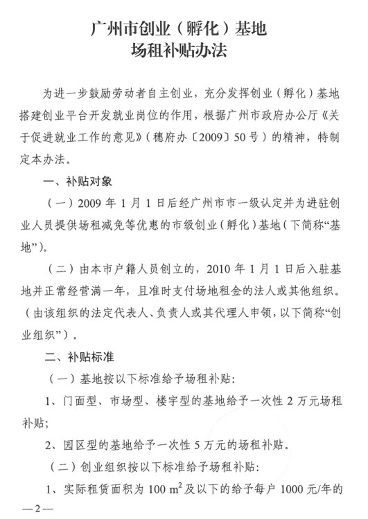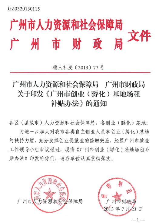 廣州市人力資源和社會保障局 廣州市財政局 關(guān)于印發(fā)《廣州市創(chuàng)業(yè)(孵化)基地場租補(bǔ)貼辦法》的通知(穗人社發(fā)〔2013〕77號)