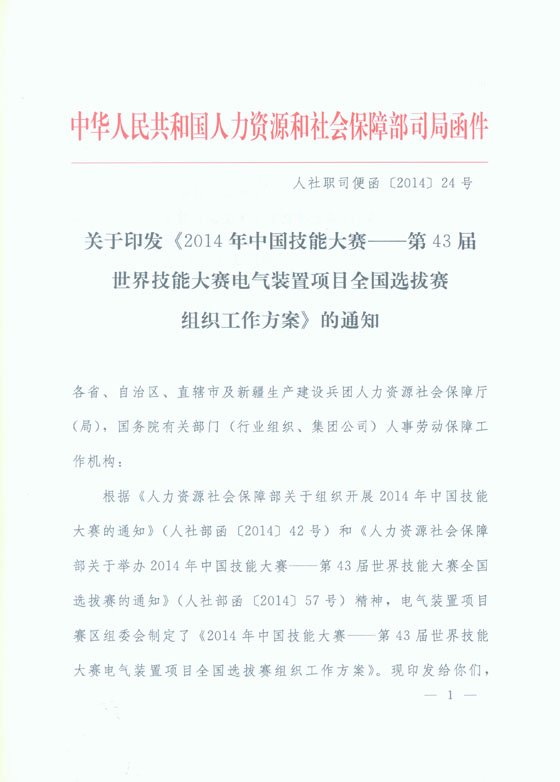 ?2014年中國(guó)技能大賽——第43屆世界技能大賽電氣裝置項(xiàng)目全國(guó)選拔賽組織工作方案