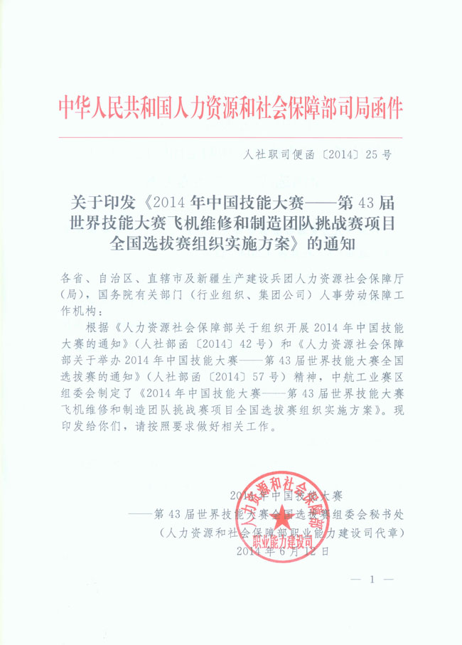 2014年中國技能大賽——第43屆世界技能大賽飛機維修和制造團隊挑戰(zhàn)賽項目全國選拔賽組織實施方案