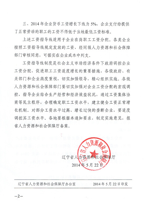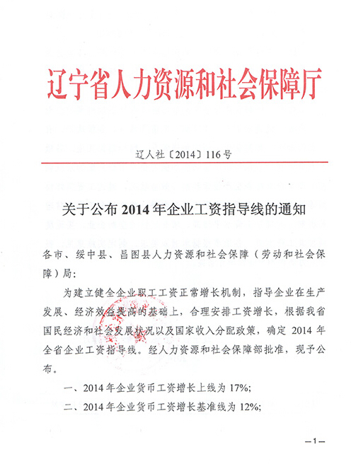 遼寧省人力資源和社會保障廳關(guān)于公布2014年企業(yè)工資指導(dǎo)線的通知(遼人社[2014]116號)