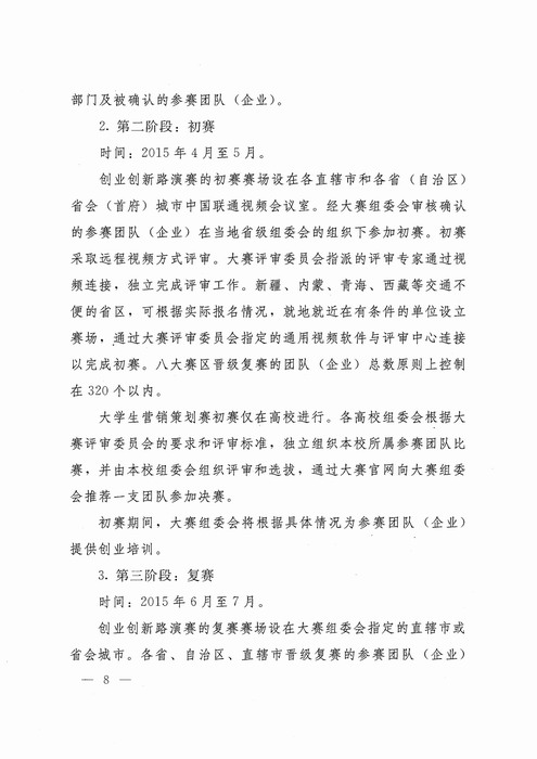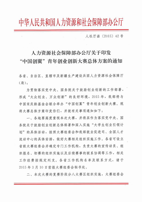 為貫徹落實(shí)黨中央、國務(wù)院關(guān)于鼓勵(lì)創(chuàng)業(yè)創(chuàng)新的工作部署,形成“大眾創(chuàng)業(yè)、萬眾創(chuàng)新”的良好環(huán)境,2015年,我部將與中國宋慶齡基金會(huì)聯(lián)合舉辦“中國創(chuàng)翼”青年創(chuàng)業(yè)創(chuàng)新大賽。現(xiàn)將大賽總體方案印發(fā)你們,并就有關(guān)事項(xiàng)通知如下: