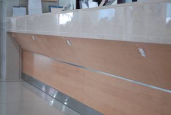 做法:在大廳整體規(guī)劃設(shè)計(jì)和家具定制時(shí),將業(yè)務(wù)柜臺(tái)由原1.1米的高度降低到0.95米,將原有的“直上直下”的柜臺(tái)變成“向里凹斜”,使服務(wù)對(duì)象有較好的舒適度。在柜臺(tái)的右下方粘貼白色小掛鉤,方便辦事群眾掛置隨身拿物品。