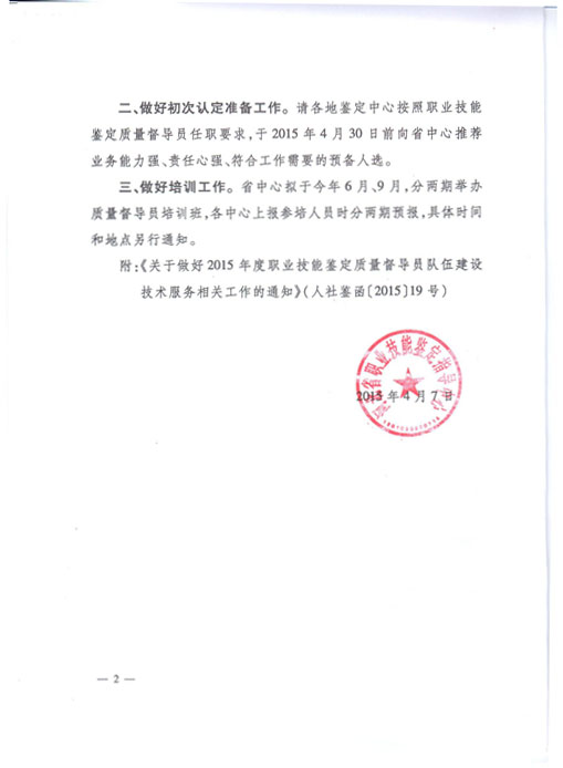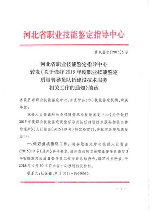 關(guān)于做好2015年度職業(yè)技能鑒定質(zhì)量督導(dǎo)員隊(duì)伍建設(shè)技術(shù)服務(wù)相關(guān)工作的通知(冀職鑒〔2015〕5號)