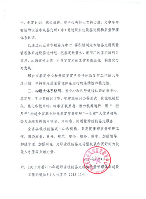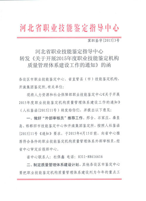 河北省職業(yè)技能鑒定指導(dǎo)中心轉(zhuǎn)發(fā)《關(guān)于開展2015年度職業(yè)技能鑒定機(jī)構(gòu)質(zhì)量管理體系建設(shè)工作的通知》的函(冀職鑒字〔2015〕3號(hào))