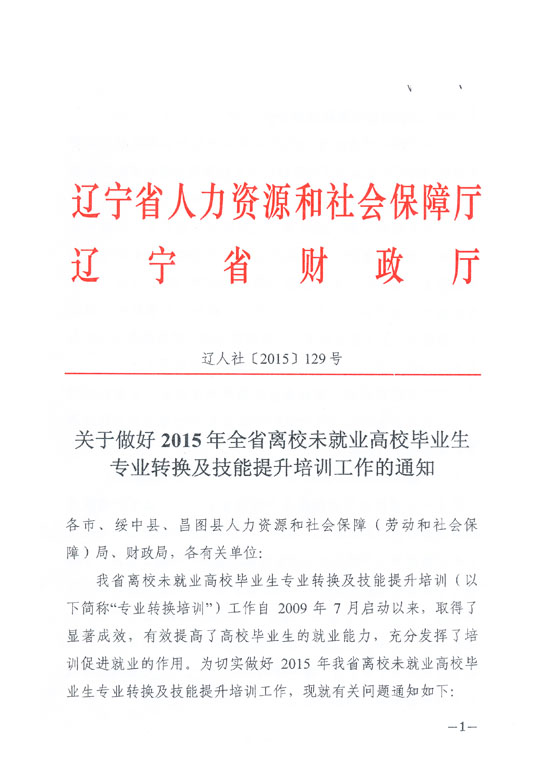 遼寧省人力資源和社會保障廳局 遼寧省財政廳關(guān)于做好2015年全省離校未就業(yè)高校畢業(yè)生專業(yè)轉(zhuǎn)換及技能提升培訓(xùn)工作的通知(遼人社[2015]129號)