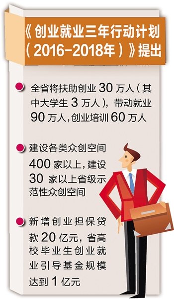 2016-2018年,通過(guò)各方共同努力,使城鄉(xiāng)勞動(dòng)者創(chuàng)業(yè)規(guī)模、比例繼續(xù)得到擴(kuò)大和提高,創(chuàng)業(yè)創(chuàng)新帶動(dòng)就業(yè)、催生經(jīng)濟(jì)發(fā)展新動(dòng)力效應(yīng)愈加彰顯。扶助創(chuàng)業(yè)30萬(wàn)人(其中大學(xué)生3萬(wàn)人),帶動(dòng)就業(yè)90萬(wàn)人,創(chuàng)業(yè)培訓(xùn)60萬(wàn)人;建設(shè)各類創(chuàng)業(yè)孵化基地、創(chuàng)業(yè)園區(qū)、創(chuàng)客空間等眾創(chuàng)空間400家以上;新增創(chuàng)業(yè)擔(dān)保貸款20億元;省高校畢業(yè)生創(chuàng)業(yè)就業(yè)引導(dǎo)基金規(guī)模達(dá)到1億元。