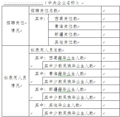 (六)做好活動總結。各有關中央企業(yè)要在專場招聘活動結束后認真總結活動情況,包括基本做法、提供崗位數(shù)、達成就業(yè)意向情況、存在的問題和意見建議等,并填寫《第五屆中央企業(yè)面向西藏青海新疆高校畢業(yè)生專場招聘活動擬錄用情況表》(附件2),于6月8日前分別報送人力資源社會保障部就業(yè)促進司和國資委企業(yè)分配局。