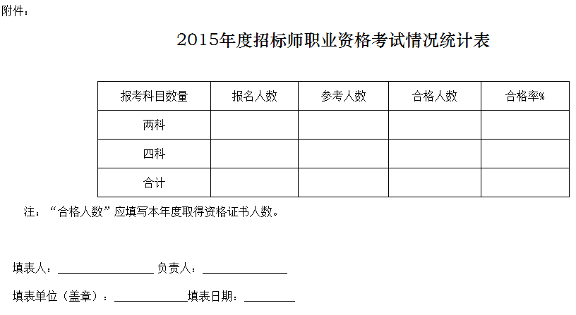 二、請(qǐng)各地按招標(biāo)師職業(yè)資格考試合格標(biāo)準(zhǔn)對(duì)考試人員各科目成績進(jìn)行復(fù)核,并與我部人事考試中心核對(duì)數(shù)據(jù),確認(rèn)無誤后,按要求填寫《2015年度招標(biāo)師職業(yè)資格考試情況統(tǒng)計(jì)表》(見附件),并于2016年2月19日前送我部專業(yè)技術(shù)人員管理司備案,備案數(shù)據(jù)將作為發(fā)放證書的依據(jù)。