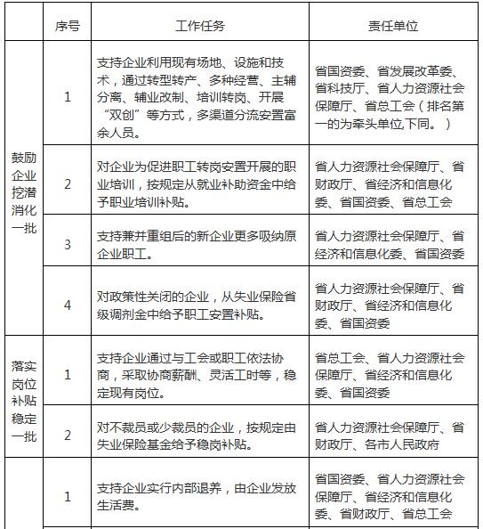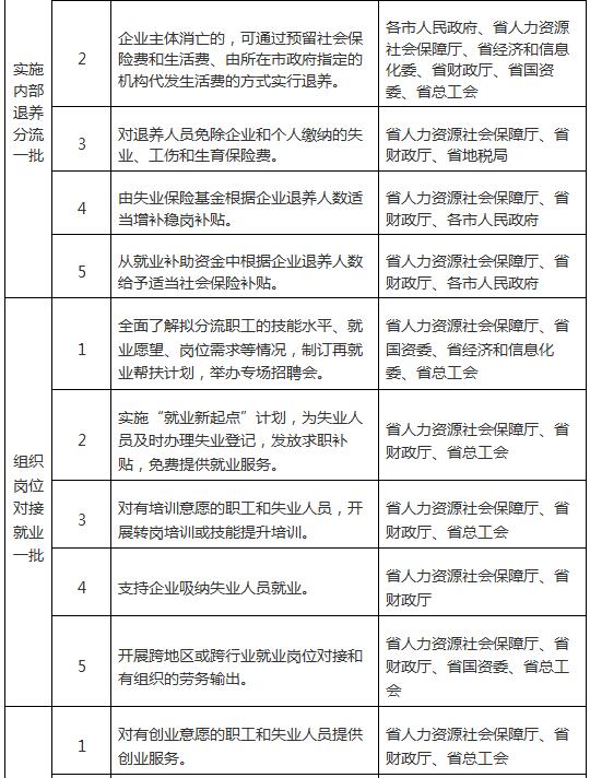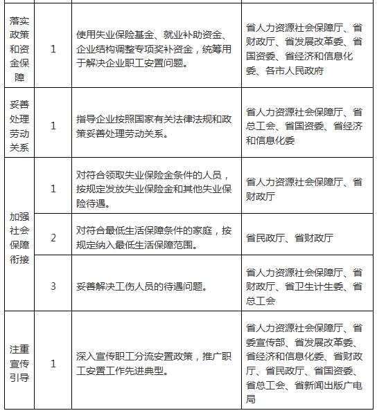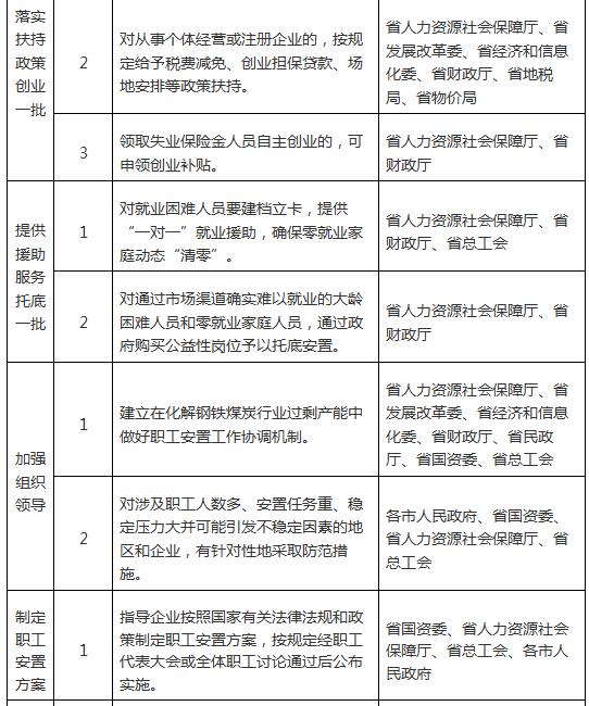 堅(jiān)持企業(yè)主體、地方組織、依法依規(guī)的原則,更多運(yùn)用市場(chǎng)辦法,因地因企制宜,分類(lèi)有序施策,通過(guò)鼓勵(lì)企業(yè)挖潛消化一批、落實(shí)崗位補(bǔ)貼穩(wěn)定一批、實(shí)施內(nèi)部退養(yǎng)分流一批、組織崗位對(duì)接就業(yè)一批、落實(shí)扶持政策創(chuàng)業(yè)一批、提供援助服務(wù)托底一批,穩(wěn)妥做好職工安置工作,維護(hù)好職工和企業(yè)雙方的合法權(quán)益,兜牢民生底線,扎實(shí)增進(jìn)人民群眾的獲得感,為推進(jìn)我省供給側(cè)結(jié)構(gòu)性改革營(yíng)造和諧穩(wěn)定的社會(huì)環(huán)境。