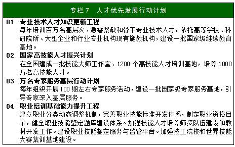 ──建設(shè)高素質(zhì)人才隊伍。適應經(jīng)濟社會發(fā)展要求,堅持人才優(yōu)先發(fā)展,做大做強專業(yè)技術(shù)人才隊伍和高技能人才隊伍。提高人才質(zhì)量,優(yōu)化人才結(jié)構(gòu),加快建設(shè)人才強國。到“十三五”期末,專業(yè)技術(shù)人才總量達到7500萬人,高、中、初級專業(yè)技術(shù)人才比例為10:40:50;高技能人才總量達到5500萬人。