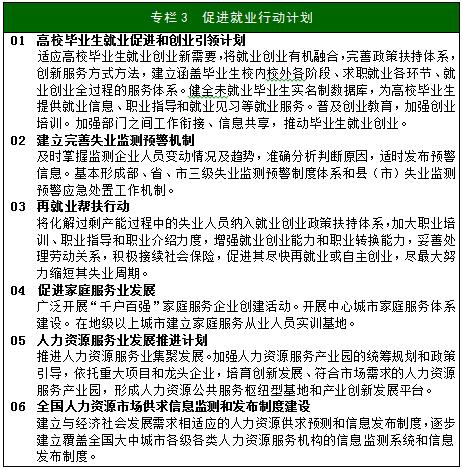 加強就業(yè)政策與財稅、金融、產(chǎn)業(yè)、貿(mào)易等政策的銜接,形成有利于促進就業(yè)的宏觀經(jīng)濟政策體系。圍繞解決結構性就業(yè)矛盾、提高就業(yè)質量,進一步完善積極的就業(yè)政策。支持勞動者自謀職業(yè)和自主創(chuàng)業(yè),支持企業(yè)吸納重點群體就業(yè),提高政策的針對性和有效性。加強對靈活就業(yè)、新就業(yè)形態(tài)的政策支持。積極發(fā)展家庭服務業(yè),促進專業(yè)化、規(guī)模化和網(wǎng)絡化發(fā)展,推進規(guī)范化、職業(yè)化建設。發(fā)揮失業(yè)保險援企穩(wěn)崗作用。加強全國就業(yè)信息監(jiān)測平臺和就業(yè)信息公共服務平臺建設,為社會提供公共就業(yè)信息服務。完善就業(yè)失業(yè)統(tǒng)計指標體系,健全失業(yè)監(jiān)測預警機制,推動適時發(fā)布城鎮(zhèn)調(diào)查失業(yè)率,強化對部分地區(qū)、行業(yè)規(guī)模性失業(yè)的監(jiān)測,建立應對預案和工作機制。