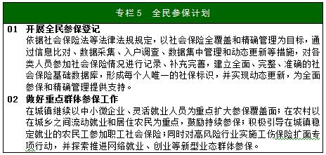 ──建立更加公平更可持續(xù)的社會保障制度。全面推進社會保障制度改革,覆蓋城鄉(xiāng)居民的社會保障體系全面建成,基本實現(xiàn)法定人員全覆蓋。完善社會保險籌資機制,建立社會保險待遇正常調(diào)整機制,穩(wěn)步提高統(tǒng)籌層次和保障水平,實現(xiàn)基金的安全可持續(xù)運行。到“十三五”期末,城鎮(zhèn)職工基本養(yǎng)老保險參保人數(shù)達到4.25億人,城鄉(xiāng)居民基本養(yǎng)老保險參保人數(shù)達到5.2億人,基本養(yǎng)老保險參保率達到90%,基本醫(yī)療保險參保率穩(wěn)定在95%以上,失業(yè)保險參保人數(shù)達到1.8億人,工傷保險參保人數(shù)達到2.2億人,生育保險參保人數(shù)達到2億人。