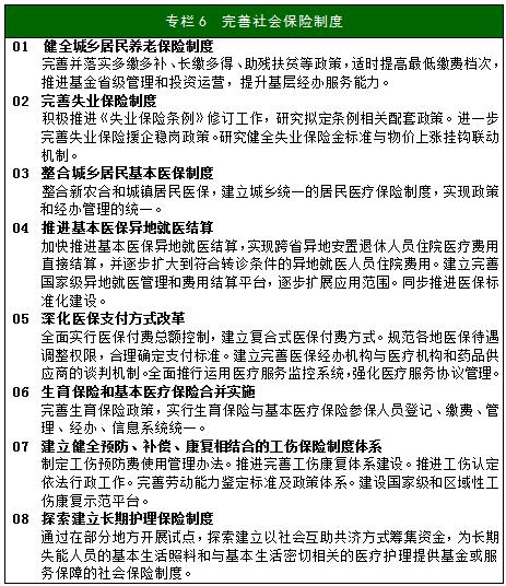完善統(tǒng)賬結合的城鎮(zhèn)職工基本養(yǎng)老保險制度。完善職工養(yǎng)老保險個人賬戶制度。規(guī)范職工和城鄉(xiāng)居民基本養(yǎng)老保險繳費政策,健全參保繳費激勵約束機制,提高收付透明度。實現(xiàn)職工基礎養(yǎng)老金全國統(tǒng)籌。出臺病殘津貼、遺屬撫恤政策。制定出臺漸進式延遲退休年齡方案。完善失業(yè)保險制度,規(guī)范失業(yè)保險基金收支管理,充分發(fā)揮失業(yè)保險保障失業(yè)人員基本生活、預防失業(yè)、促進就業(yè)的功能。建立統(tǒng)一的城鄉(xiāng)居民基本醫(yī)療保險制度和經(jīng)辦運行機制,整合基本制度政策,理順管理體制,提升服務效能。積極探索推進醫(yī)療保險省級統(tǒng)籌。健全醫(yī)療保險穩(wěn)定可持續(xù)籌資機制。完善醫(yī)保繳費參保政策。全面實施城鄉(xiāng)居民大病保險制度,進一步完善重特大疾病保障機制。深化支付方式改革,發(fā)揮醫(yī)保在醫(yī)改中的基礎性作用。改進職工基本醫(yī)療保險個人賬戶,開展門診費用統(tǒng)籌。將生育保險和基本醫(yī)療保險合并實施。制定公務員和參照公務員法管理事業(yè)單位、社會團體工作人員工傷保險政策。探索適應靈活就業(yè)人員的工傷保險保障方式。全面實施工傷保險省級統(tǒng)籌。積極推進工傷預防與工傷康復工作。完善社會保險轉移接續(xù)政策,建立更加便捷的社會保險轉移接續(xù)機制。實施職業(yè)年金制度,著力擴大企業(yè)年金覆蓋面,鼓勵發(fā)展補充醫(yī)療保險、商業(yè)健康保險、商業(yè)養(yǎng)老保險,推出個人稅收遞延型養(yǎng)老保險,促進商業(yè)保險與社會保險、補充保險相銜接,鼓勵商業(yè)保險機構參與醫(yī)保經(jīng)辦,探索工傷保險與商業(yè)保險的合作模式,形成多層次的保障體系。探索建立長期護理保險制度,開展長期護理保險試點。