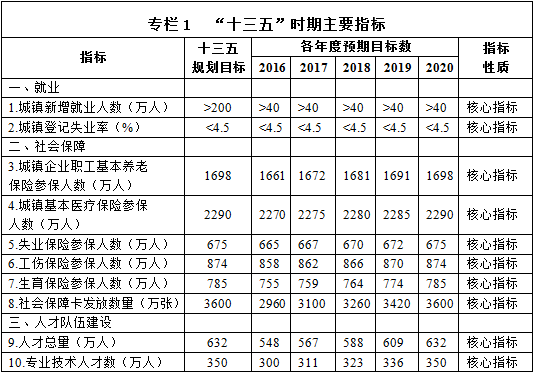 ——實現(xiàn)比較充分和更高質(zhì)量就業(yè)。加強就業(yè)創(chuàng)業(yè)政策與宏觀經(jīng)濟政策的有效銜接,促進經(jīng)濟增長與擴大就業(yè)的良性互動,保證人力資源對經(jīng)濟社會發(fā)展的供給。統(tǒng)籌推進重點群體就業(yè)創(chuàng)業(yè),著力化解就業(yè)總量壓力、結(jié)構(gòu)性就業(yè)矛盾和規(guī)模性失業(yè)風險,保持就業(yè)局勢總體穩(wěn)定。到“十三五”期末全省城鎮(zhèn)新增就業(yè)累計不低于200萬人,城鎮(zhèn)登記失業(yè)率控制在4.5%以內(nèi)。