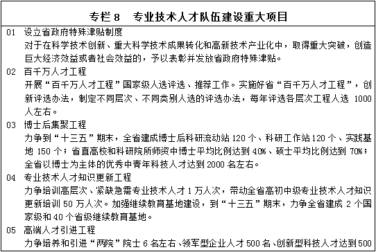 ——建設(shè)高素質(zhì)人才隊伍。完善人才政策,構(gòu)建科學培養(yǎng)、大力引進、廣泛集聚、用好用活、吸引留住人才的體制機制,建成能夠支撐創(chuàng)新驅(qū)動發(fā)展、規(guī)模宏大、具有強大競爭力的專業(yè)技術(shù)人才隊伍和技能人才隊伍,滿足振興發(fā)展需求。到“十三五”期末全省人才總量達到632萬人,其中專業(yè)技術(shù)人才達到350萬人、高技能人才達到111萬人。