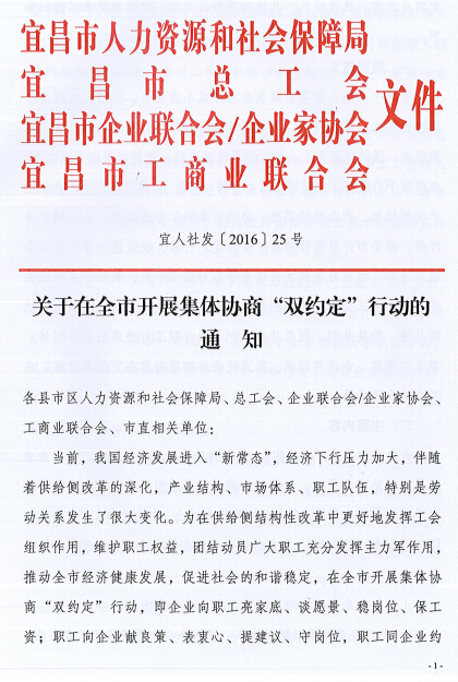 宜昌市人力資源和社會保障局等四部門關(guān)于在全市開展集體協(xié)商“雙約定”行動的通知(宜人社發(fā)〔2016〕25號)