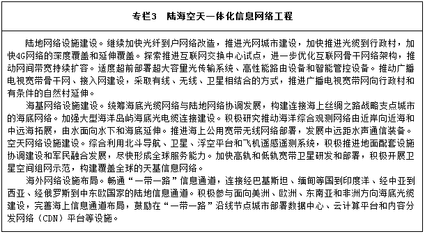 建設(shè)陸海空天一體化信息基礎(chǔ)設(shè)施。建立國家網(wǎng)絡(luò)空間基礎(chǔ)設(shè)施統(tǒng)籌協(xié)調(diào)機制,推動信息基礎(chǔ)設(shè)施建設(shè)、應(yīng)用和管理。加快空間互聯(lián)網(wǎng)部署,整合基于衛(wèi)星的天基網(wǎng)絡(luò)、基于海底光纜的海洋網(wǎng)絡(luò)和傳統(tǒng)的陸地網(wǎng)絡(luò),實施天基組網(wǎng)、地網(wǎng)跨代,推動空間與地面設(shè)施互聯(lián)互通,構(gòu)建覆蓋全球、無縫連接的天地空間信息系統(tǒng)和服務(wù)能力。持續(xù)推進北斗系統(tǒng)建設(shè)和應(yīng)用,加快構(gòu)建和完善北斗導(dǎo)航定位基準(zhǔn)站網(wǎng)。積極布局浮空平臺、低軌衛(wèi)星通信、空間互聯(lián)網(wǎng)等前沿網(wǎng)絡(luò)技術(shù)。加快海上和水下通信技術(shù)的研發(fā)和推廣,增強海洋信息通信能力、綜合感知能力、信息分析處理能力、綜合管控運維能力、智慧服務(wù)能力,推動智慧海洋工程建設(shè)。