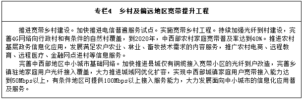 實施網(wǎng)絡(luò)覆蓋工程。加快貧困地區(qū)互聯(lián)網(wǎng)建設(shè)和應(yīng)用步伐,鼓勵電信企業(yè)積極承擔(dān)社會責(zé)任,確保寬帶進村入戶與脫貧攻堅相向而行。加快推進貧困地區(qū)網(wǎng)絡(luò)覆蓋,深入落實提速降費,探索面向貧困戶的網(wǎng)絡(luò)資費優(yōu)惠。加快安全可靠移動終端研發(fā)和生產(chǎn)應(yīng)用,推動民族語言語音、視頻技術(shù)和軟件研發(fā),降低少數(shù)民族使用移動終端和獲取信息服務(wù)的語言障礙。