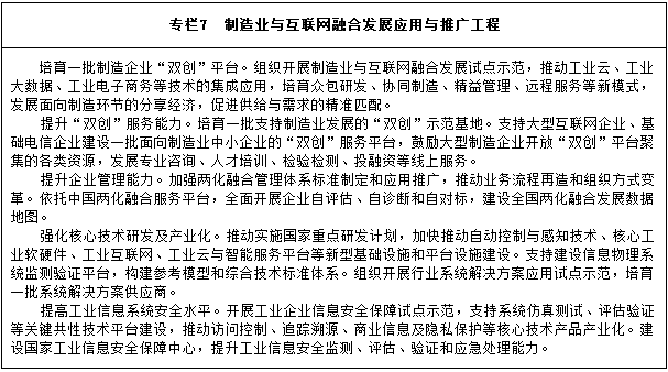 推進信息化和工業(yè)化深度融合。在推進實施“中國制造2025”過程中,深化制造業(yè)與互聯(lián)網(wǎng)融合發(fā)展,加快構(gòu)建自動控制與感知技術(shù)、工業(yè)軟硬件、工業(yè)云與智能服務(wù)平臺、工業(yè)互聯(lián)網(wǎng)等制造業(yè)新基礎(chǔ),建立完善智能制造標(biāo)準(zhǔn)體系,增強制造業(yè)自動化、數(shù)字化、智能化基礎(chǔ)技術(shù)和產(chǎn)業(yè)支撐能力。組織實施“芯火”計劃和傳感器產(chǎn)業(yè)提升工程,加快傳感器、過程控制芯片、可編程邏輯控制器等研發(fā)和產(chǎn)業(yè)化。加快計算機輔助設(shè)計仿真、制造執(zhí)行系統(tǒng)、產(chǎn)品全生命周期管理等工業(yè)軟件的研發(fā)和產(chǎn)業(yè)化,加強軟件定義和支撐制造業(yè)的基礎(chǔ)性作用。支持開展關(guān)鍵技術(shù)、網(wǎng)絡(luò)、平臺、應(yīng)用環(huán)境的兼容適配、互聯(lián)互通和互操作測試驗證,推動工業(yè)軟硬件與工業(yè)大數(shù)據(jù)平臺、工業(yè)網(wǎng)絡(luò)、工業(yè)信息安全系統(tǒng)、智能裝備的集成應(yīng)用。積極推進制造企業(yè)“雙創(chuàng)”以及工業(yè)云、工業(yè)大數(shù)據(jù)、工業(yè)電子商務(wù)等服務(wù)平臺建設(shè)和服務(wù)模式創(chuàng)新,全面提升行業(yè)系統(tǒng)解決方案能力。推動工業(yè)互聯(lián)網(wǎng)研發(fā)應(yīng)用,制定工業(yè)互聯(lián)網(wǎng)總體體系架構(gòu)方案,組織開展工業(yè)互聯(lián)網(wǎng)關(guān)鍵資源管理平臺和核心技術(shù)試驗驗證平臺建設(shè),加快形成工業(yè)互聯(lián)網(wǎng)健康發(fā)展新生態(tài)。組織實施企業(yè)管理能力提升工程,加快信息化和工業(yè)化融合管理體系標(biāo)準(zhǔn)制定和應(yīng)用推廣。