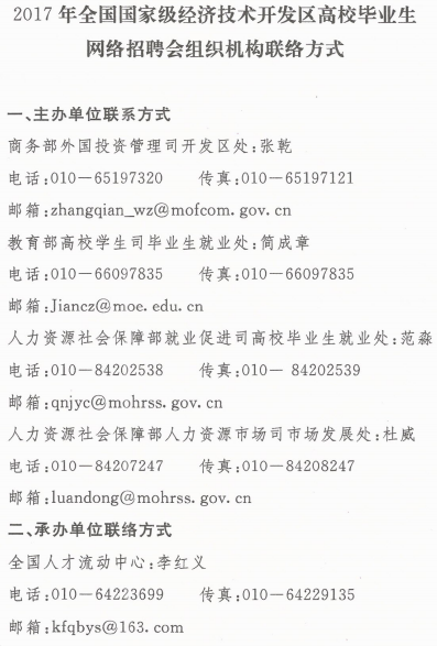 1.2017 年全國國家級經(jīng)濟(jì)技術(shù)開發(fā)區(qū)高校畢業(yè)生網(wǎng)絡(luò)招聘會組織機(jī)構(gòu)聯(lián)絡(luò)方式(見附件1)
