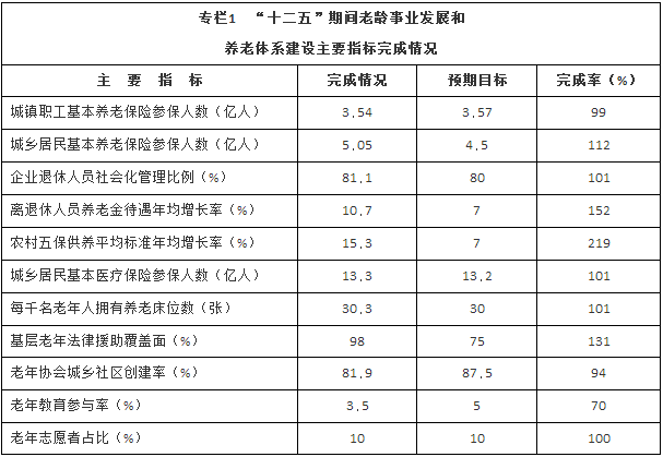 “十二五”時期我國老齡事業(yè)和養(yǎng)老體系建設取得長足發(fā)展。《中國老齡事業(yè)發(fā)展“十二五”規(guī)劃》、《社會養(yǎng)老服務體系建設規(guī)劃(2011—2015年)》確定的目標任務基本完成。老年人權益保障和養(yǎng)老服務業(yè)發(fā)展等方面的法規(guī)政策不斷完善;基本養(yǎng)老、基本醫(yī)療保障覆蓋面不斷擴大,保障水平逐年提高;以居家為基礎、社區(qū)為依托、機構為補充、醫(yī)養(yǎng)相結合的養(yǎng)老服務體系初步形成,養(yǎng)老床位數量達到672.7萬張;老年宜居環(huán)境建設持續(xù)推進,老年人社會參與條件繼續(xù)優(yōu)化;老年文化、體育、教育事業(yè)快速發(fā)展,老年人精神文化生活日益豐富;老年人優(yōu)待項目更加豐富、范圍大幅拓寬,敬老養(yǎng)老助老社會氛圍日益濃厚,老年人的獲得感和幸福感明顯增強。
