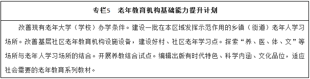 落實老年教育發(fā)展規(guī)劃,擴大老年教育資源供給,拓展老年教育發(fā)展路徑,加強老年教育支持服務,創(chuàng)新老年教育發(fā)展機制,促進老年教育可持續(xù)發(fā)展,優(yōu)先發(fā)展城鄉(xiāng)社區(qū)老年教育,促進各級各類學校開展老年教育,部門、行業(yè)企業(yè)、高校舉辦的老年大學要進一步提高面向社會辦學開放度,支持鼓勵各類社會力量舉辦或參與老年教育。實施社會主義核心價值觀培育、老年教育機構基礎能力提升、學習資源建設整合、遠程老年教育推進等計劃。到2020年,基本形成覆蓋廣泛、靈活多樣、特色鮮明、規(guī)范有序的老年教育新格局。全國縣級以上城市至少應有一所老年大學。