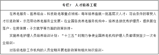 壯大人才隊伍。推進涉老相關專業(yè)教育體系建設,加快培養(yǎng)老年醫(yī)學、康復、護理、營養(yǎng)、心理和社會工作、經營管理、康復輔具配置等人才。建立以品德、能力和業(yè)績?yōu)閷虻穆毞Q評價和技能等級評價制度,拓寬養(yǎng)老服務專業(yè)人員職業(yè)發(fā)展空間。推動各地保障和逐步提高養(yǎng)老服務從業(yè)人員薪酬待遇。