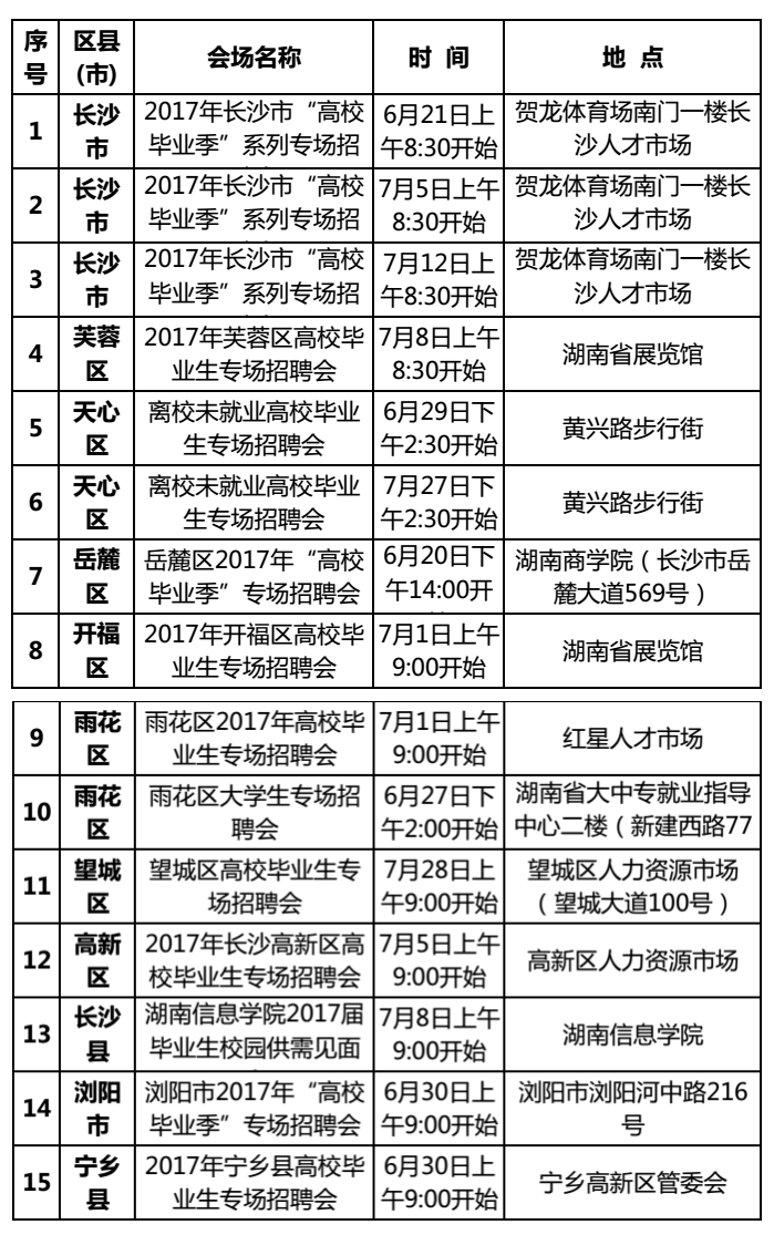 想進一步了解2017年長沙市“高校畢業(yè)季”就業(yè)服務(wù)系列專場招聘會詳細(xì)信息,請密切關(guān)注“長沙就業(yè)”微信平臺及長沙人力資源網(wǎng)(http://www.cshr.com.cn)。(彭雙林 羅奕思)